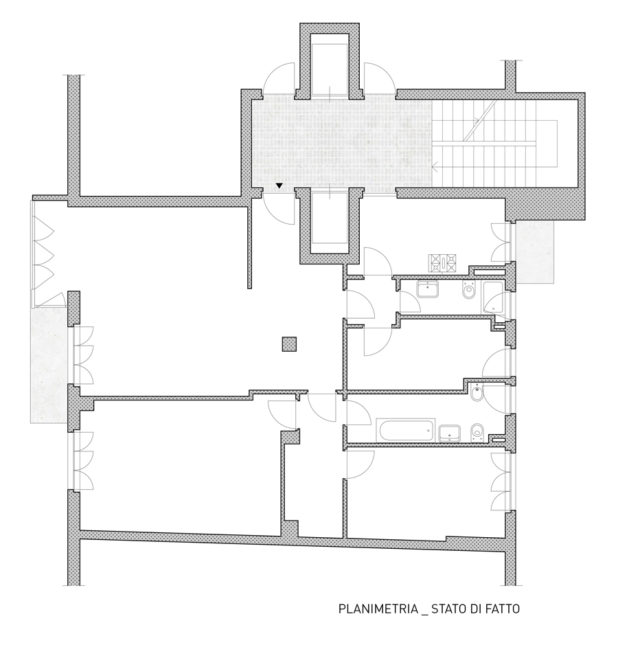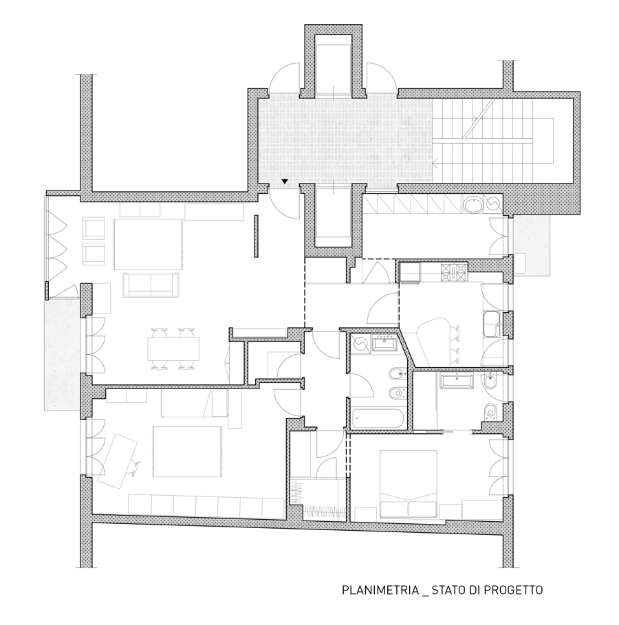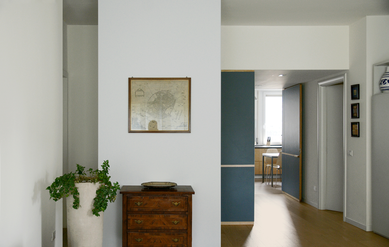Un appartamento in un classico edificio degli anni 60, caratterizzato da ambienti e bagni stretti e lunghi e cucina relegata nella zona di servizio, ben separata dagli spazi principali della casa. L’intervento modifica radicalmente l’assetto della zona servizi, ricavando un bagno cieco nella fascia centrale dell’alloggio a favore della cucina, ora illuminata da due finestre e in continuità visiva con la zona giorno. Una boiserie su disegno ingloba un capiente armadio e le porte di accesso alla cucina e alla lavanderia, unendo spazialmente i due versanti, un tempo separati, dell’appartamento.