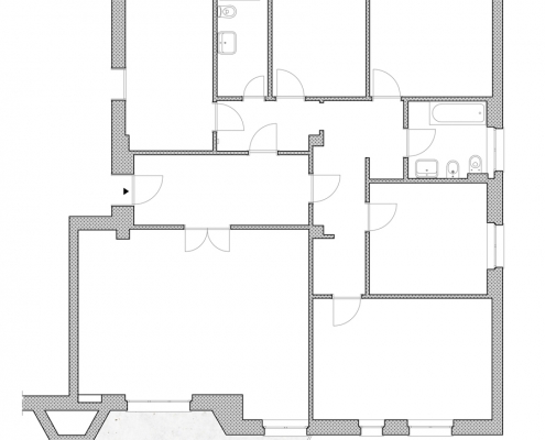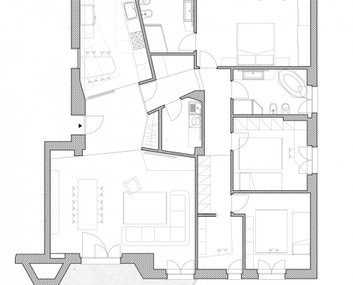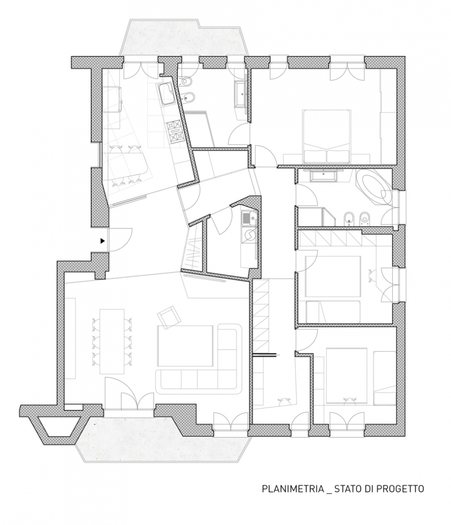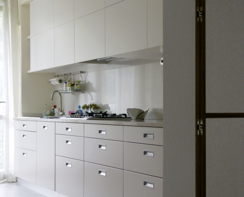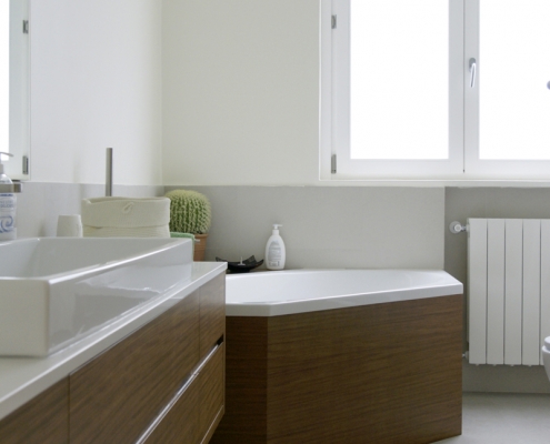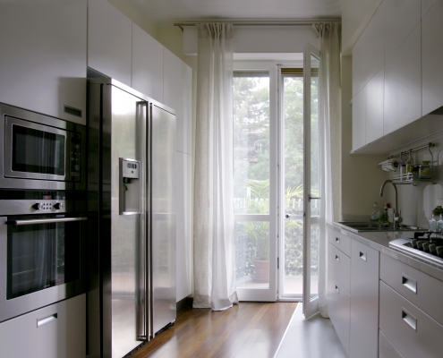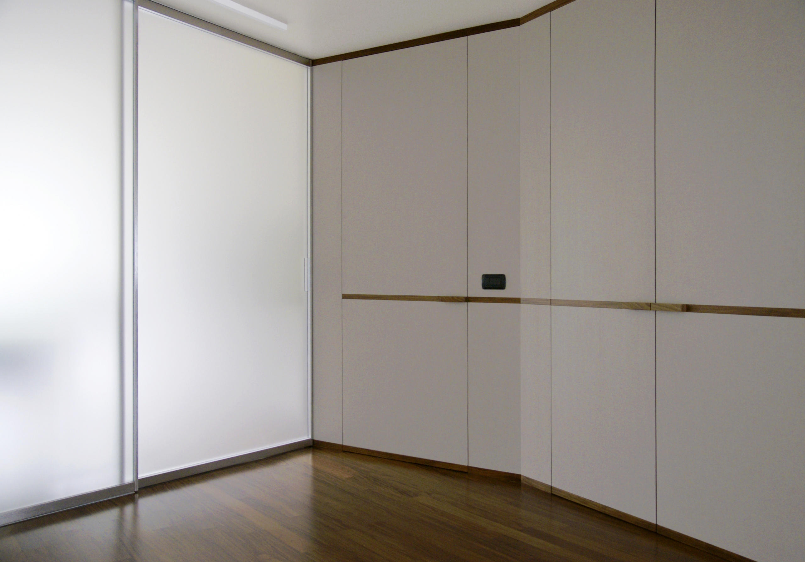 Un appartamento di discreta metratura in un condominio fine anni 60 nella periferia sud di Milano, in un quartiere ormai consolidato, ambito per l’elevata presenza di verde. L’appartamento non presenta in origine elementi di particolare valore e la pianta è schematicamente suddivisa in zona giorno/cucina e servizi/notte tramite disimpegni angusti e tante porte. I nuovi proprietari, una giovane coppia con due bambini richiedono una disposizione meno rigida degli ambienti, tre camere, un piccolo studio, una lavanderia. Il progetto modifica totalmente la zona ingresso soggiorno e la cucina, accentuando l’apertura di quest’ultima verso il living attraverso l’utilizzo di pannelli parete vetrati e modificandone la geometria: l’utilizzo di direttrici non ortogonali alle pareti perimetrali permette di ampliare la cucina a scapito dei locali di servizio e introduce inoltre un nuovo dinamismo all’intera pianta. Il nuovo assetto distributivo permette di ricavare la lavanderia e spazi di stivaggio nella fascia centrale dell’appartamento non illuminata. La boiserie su disegno cela un armadio e l’ingresso alla zona notte, donando omogeneità e rigore allo spazio.
