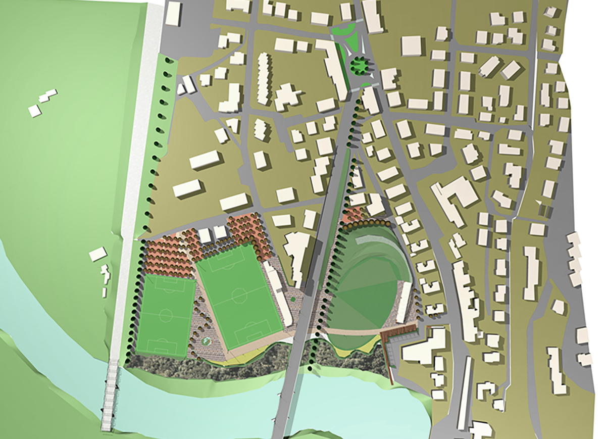 Il progetto è costituito da un percorso ciclopedonale tra la via XX Settembre e la zona subito ad est della ferrovia che attraversa una sequenza di spazi ed attrezzature pubbliche varie: una piazza e una struttura per mercato ed esposizioni, un grande prato delimitato sul lato sud da una lieve collina artificiale, il viadotto “abitato” da piccoli esercizi per commercio e servizi con relativi spazi all’aperto, due campi da calcio, uno già esistente ed uno di progetto da allenamento (m 90×60) intervallati da uno spazio pavimentato, ed infine un parcheggio piantumato ad ulivi.