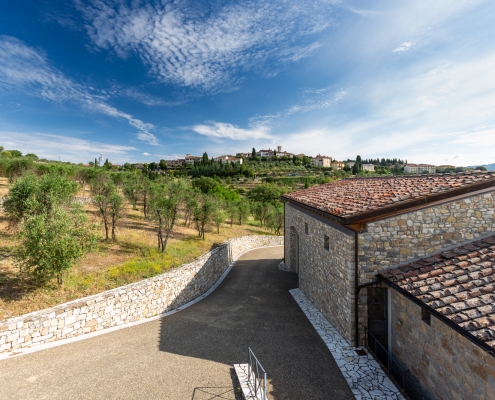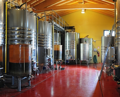 La cantina è un volume di dimensioni importanti che si aggiunge a quello preesistente. Il tema dell’ampliamento è interpretato come somma di differenti volumi aggregati in modo armonico per geometria e proporzioni. Ha struttura in cemento armato rivestita esternamente in pietra locale e copertura in legno lamellare per rispondere ai requisiti antisismici; è un ambiente di lavoro spazioso, funzionale e luminoso, caratterizzato dai grandi portoni vetrati scorrevoli che consentono la movimentazione delle attrezzature e connettono lo spazio interno con il paesaggio circostante.