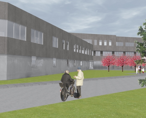 Il complesso si compone di due corpi longitudinali di profondità uguale, disposti in modo tale da intersecarsi tra loro. La giacitura non parallela dei corpi disegna spazi concavi e convessi, con gli angoli aperti verso il parco dove lo spazio si dilata e nella zona dell’ingresso , dove l’inflessione configura una sorta di corte di invito. Tra i due corpi di apre uno spazio interno, un cortile aperto verso sud, dal carattere più intimo e raccolto, sistemato a verde