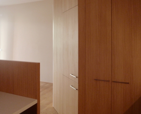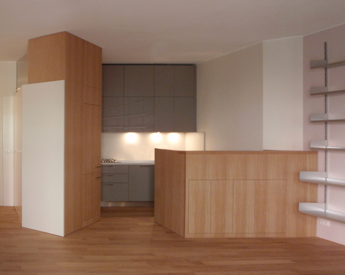 L’intervento mantiene il carattere originale degli spazi; la preesistente cucina viene annessa al soggiorno, che assume così una proporzione meno allungata e guadagna una porta finestra. La colonna libera tra l’ingresso e soggiorno viene inglobata in un elemento articolato in falegnameria, costituito da un piccolo ripostiglio lavanderia rivolto verso l’ingresso e da colonne di contenimento verso la cucina. Assume quindi il ruolo di snodo tra diversi spazi e funzioni della casa, senza invadere o stravolgere gli equilibri tra gli ambienti. Legno di rovere e compensato marino stabiliscono continuità materica tra pavimenti ed elementi di arredo fissi, mentre i colori tenui sulle pareti valorizzano la morbidezza della luce.