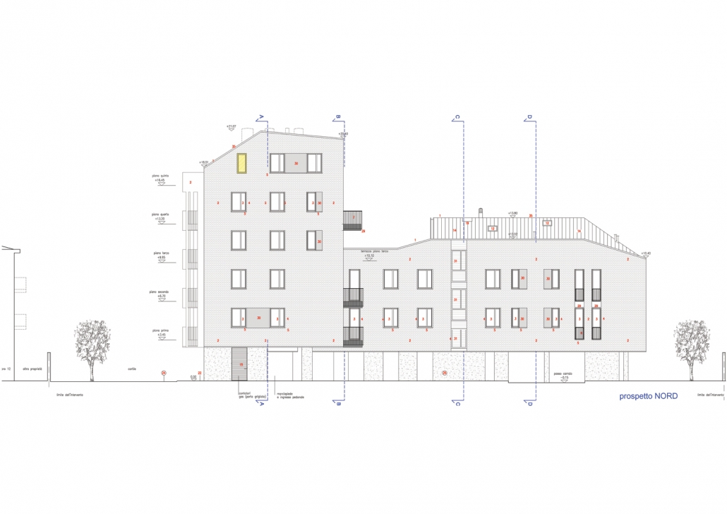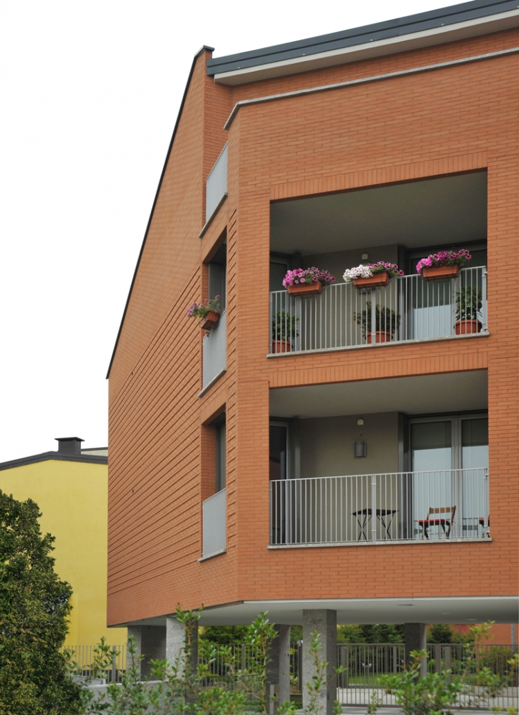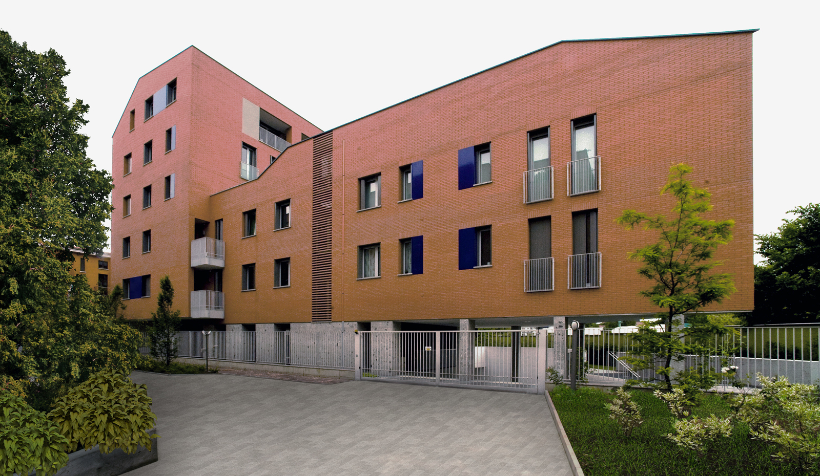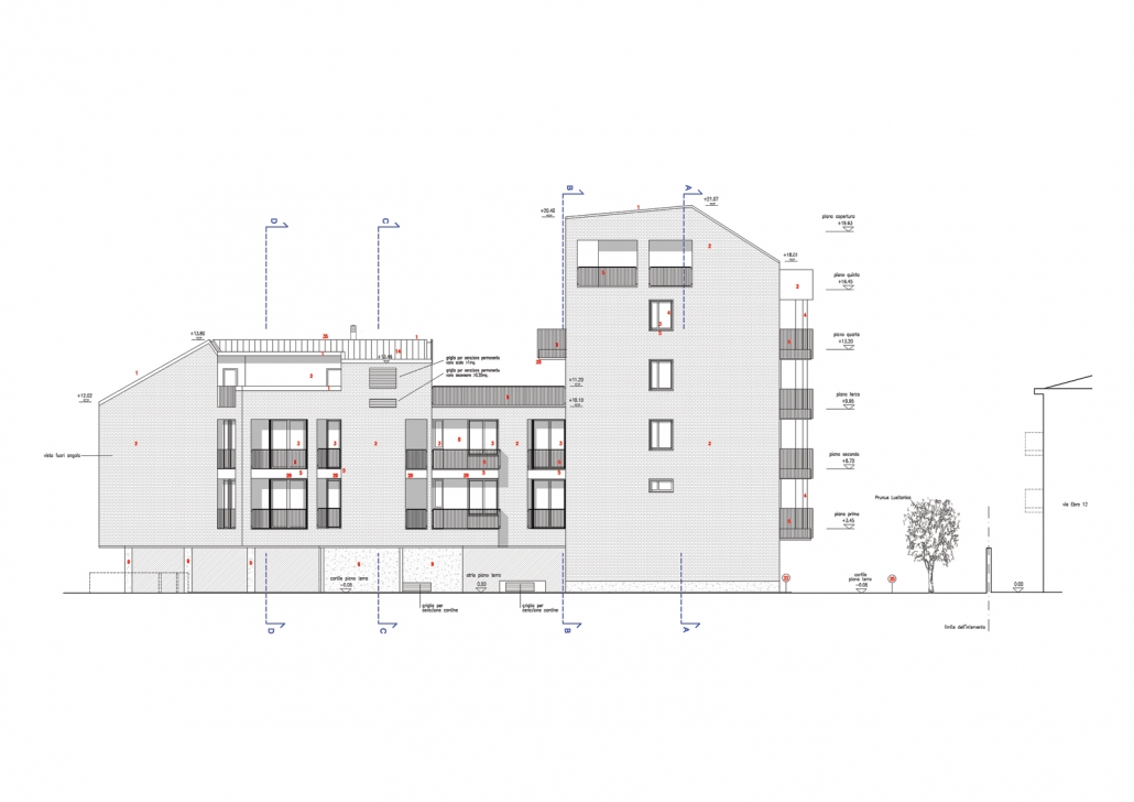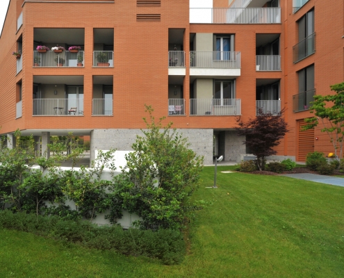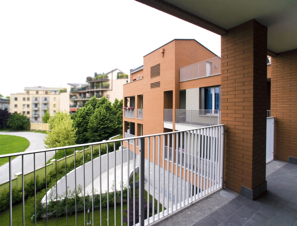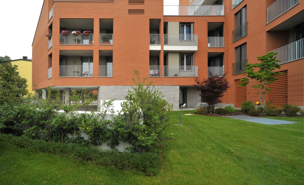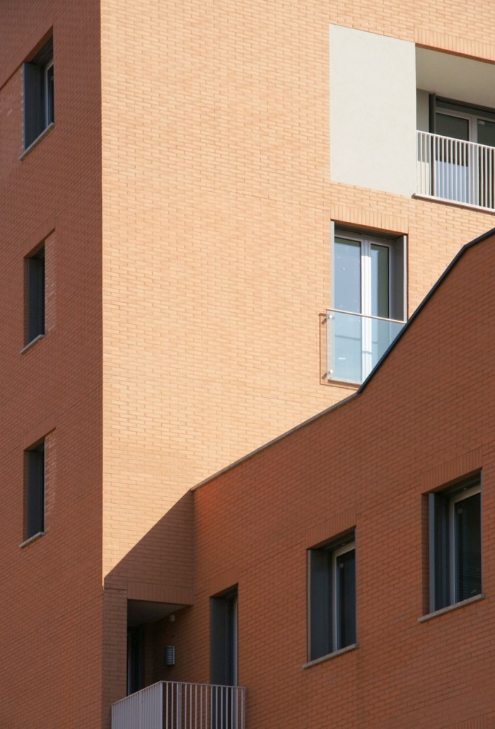 L’intervento quindi si articola in due corpi di fabbrica a formare una L, uno alto tre piani fuori terra più sottotetto parallelo alla strada privata ne definisce l’invaso; l’altro ortogonale ad essa di sei piani fuori terra più sottotetto, definisce l’area a giardino di pertinenza condominiale conferendole un carattere raccolto e luminoso allo stesso tempo, escludendo il retro di scarsa qualità architettonica dell’edificio al civico n. 12.