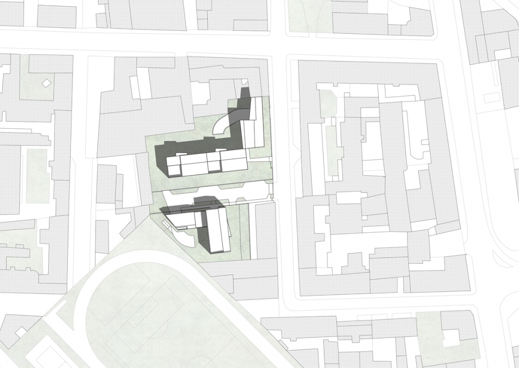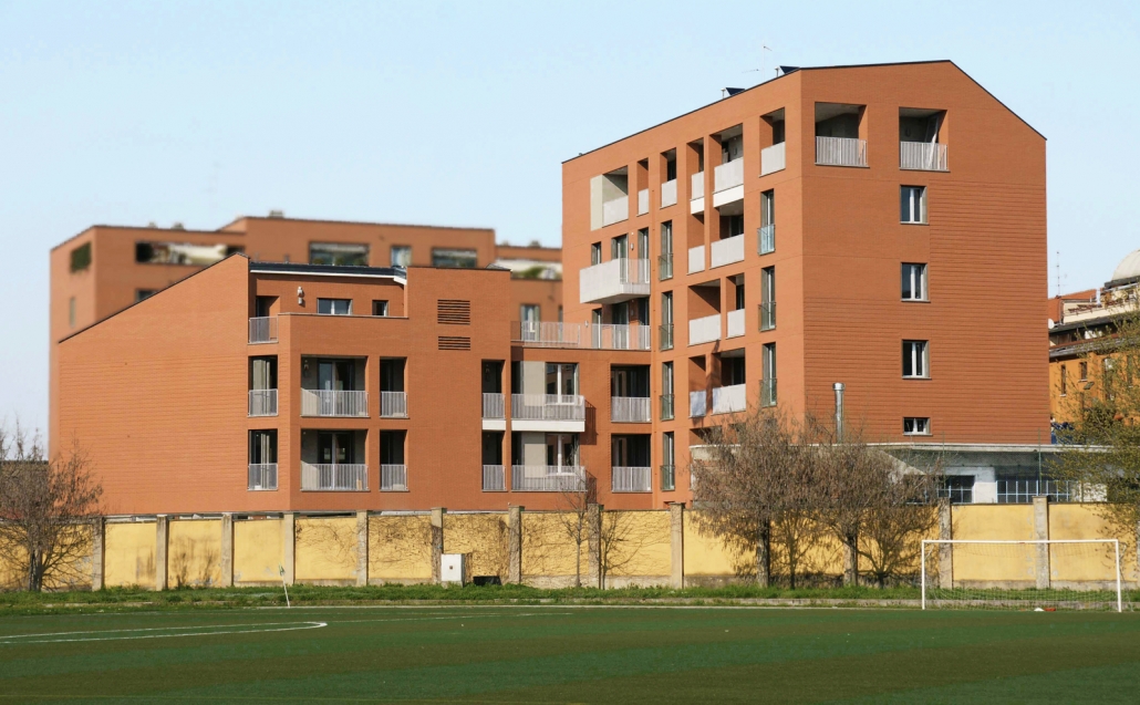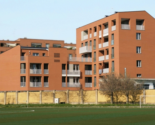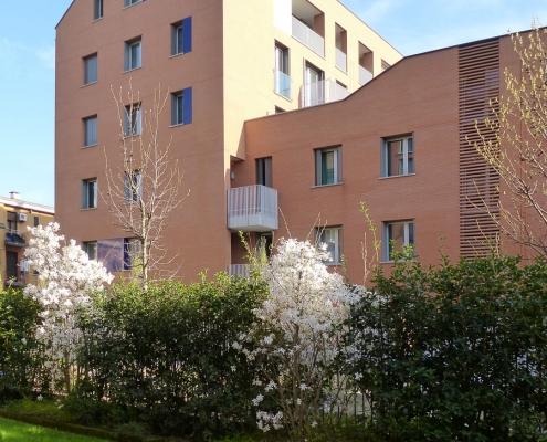 La presenza dell’area aperta della società Forza e Coraggio e dell’edificio al civico n.8 hanno determinato il tema di progetto: definire un’area aperta e raccolta di pertinenza privata che sfrutti l’ottimo soleggiamento permesso dai contigui impianti sportivi, diversificando quindi sia planimetricamente che compositivamente gli affacci verso sud e ovest da quelli nord ed est. Nel medesimo tempo non ombreggiare né chiudere totalmente le vista verso sud dell’edificio al civico n.8