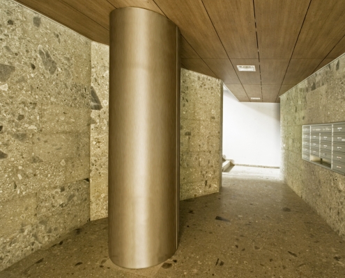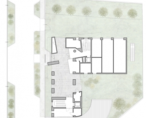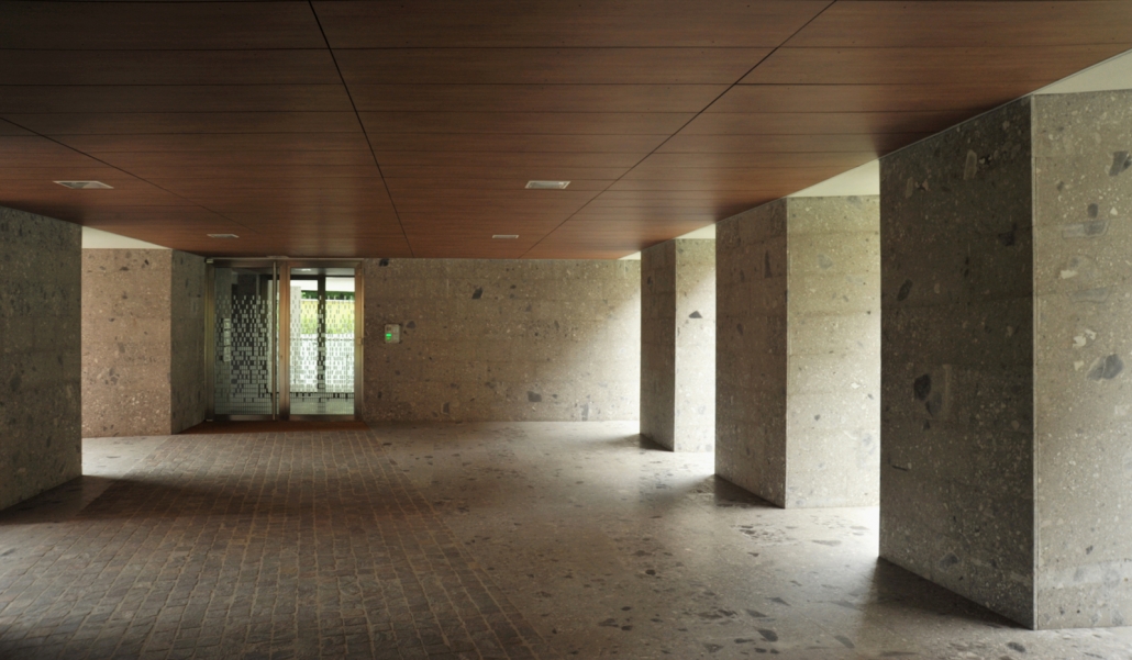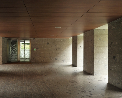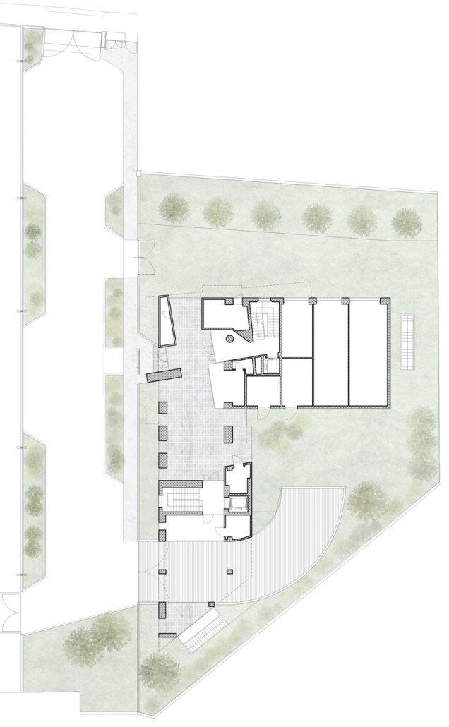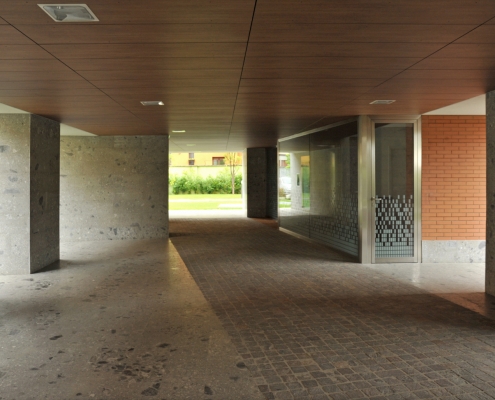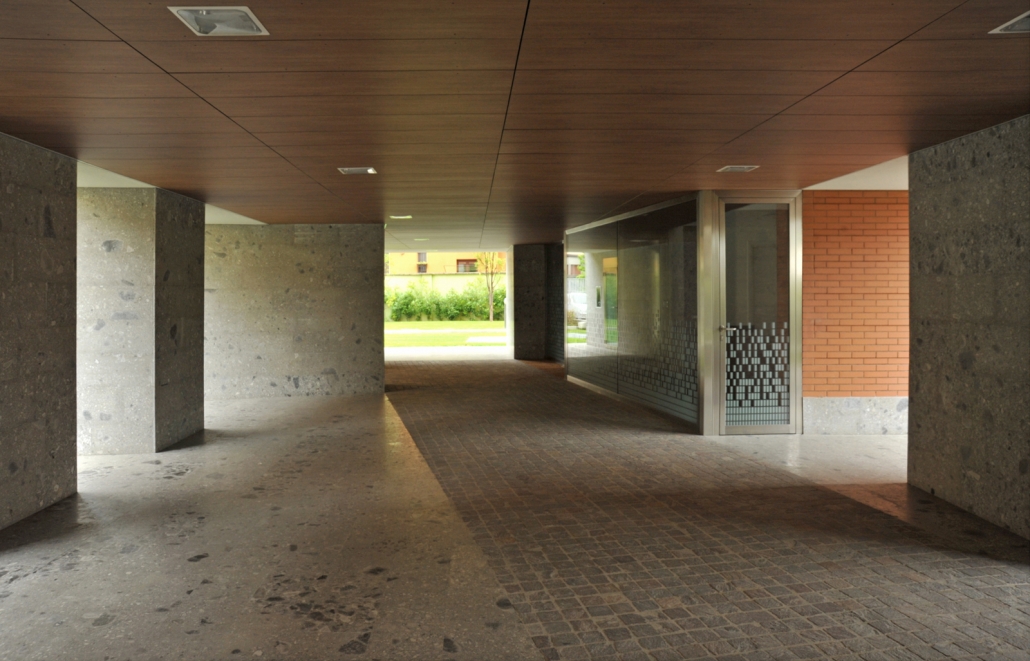 Il piano terra è caratterizzato da grandi varchi aperti verso il giardino intervallati da blocchi rivestiti in pietra di ceppo che ospitano vani per le funzioni e gli impianti condominiali. Varchi e blocchi sono inclinati rispetto al passaggio privato così da ottenere particolari scorci sul giardino ed orientare la circolazione pedonale a piano terra.